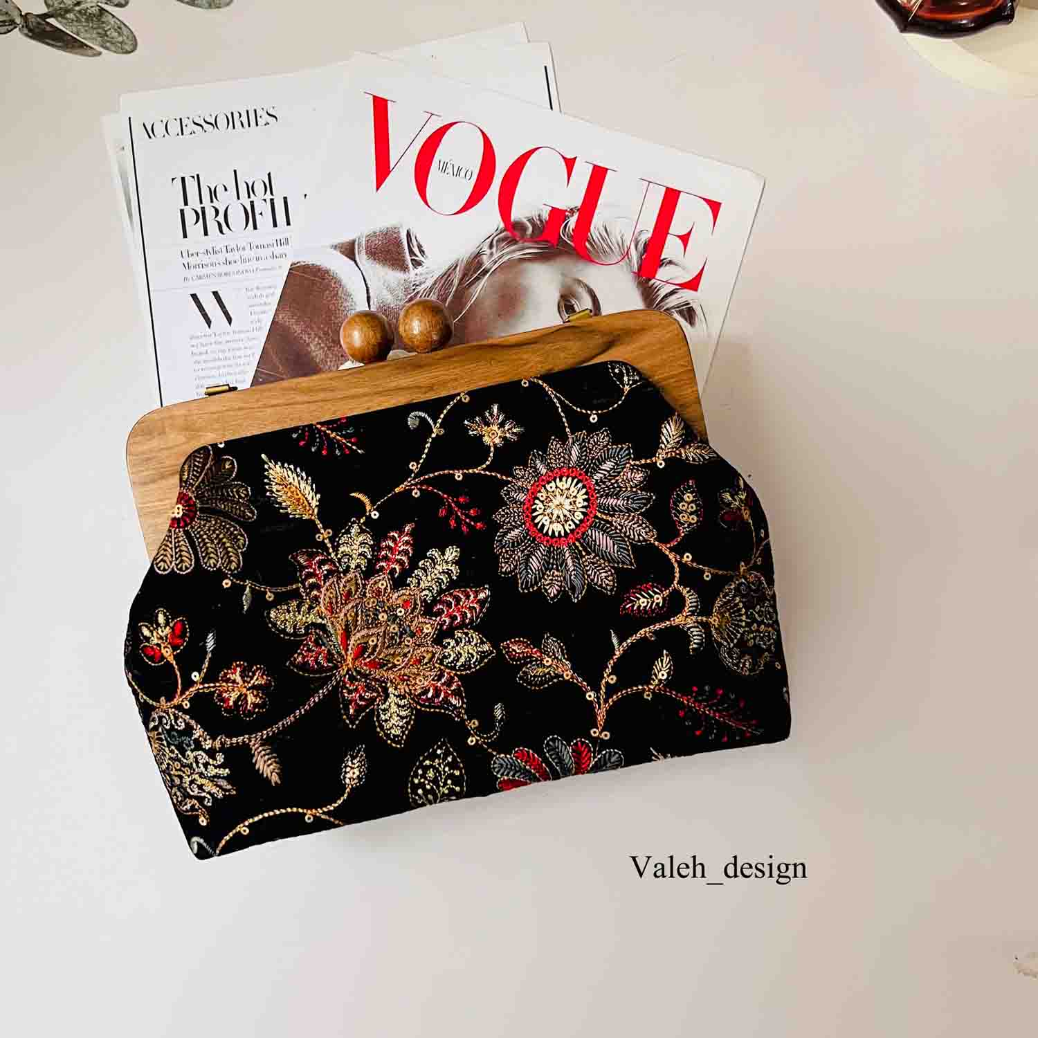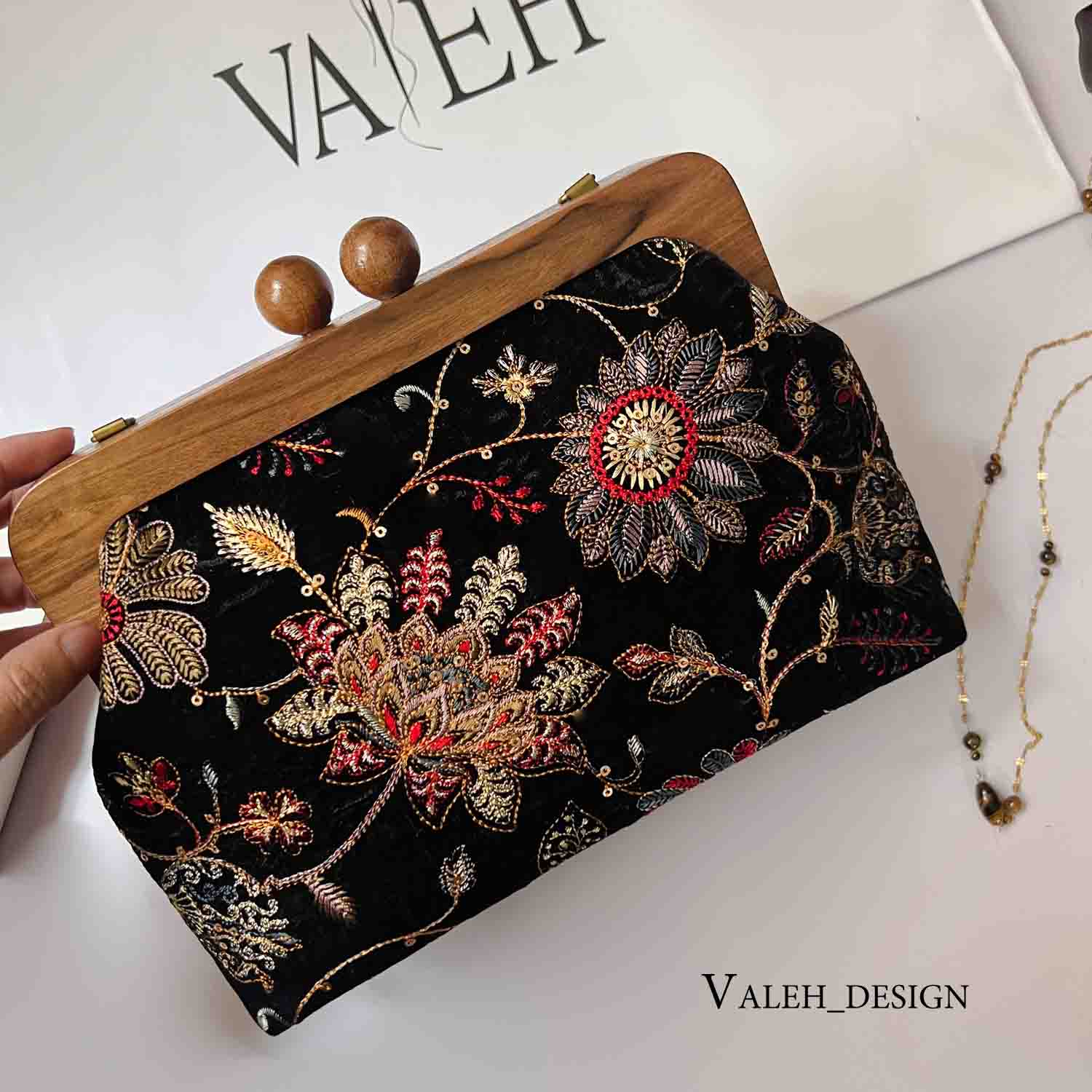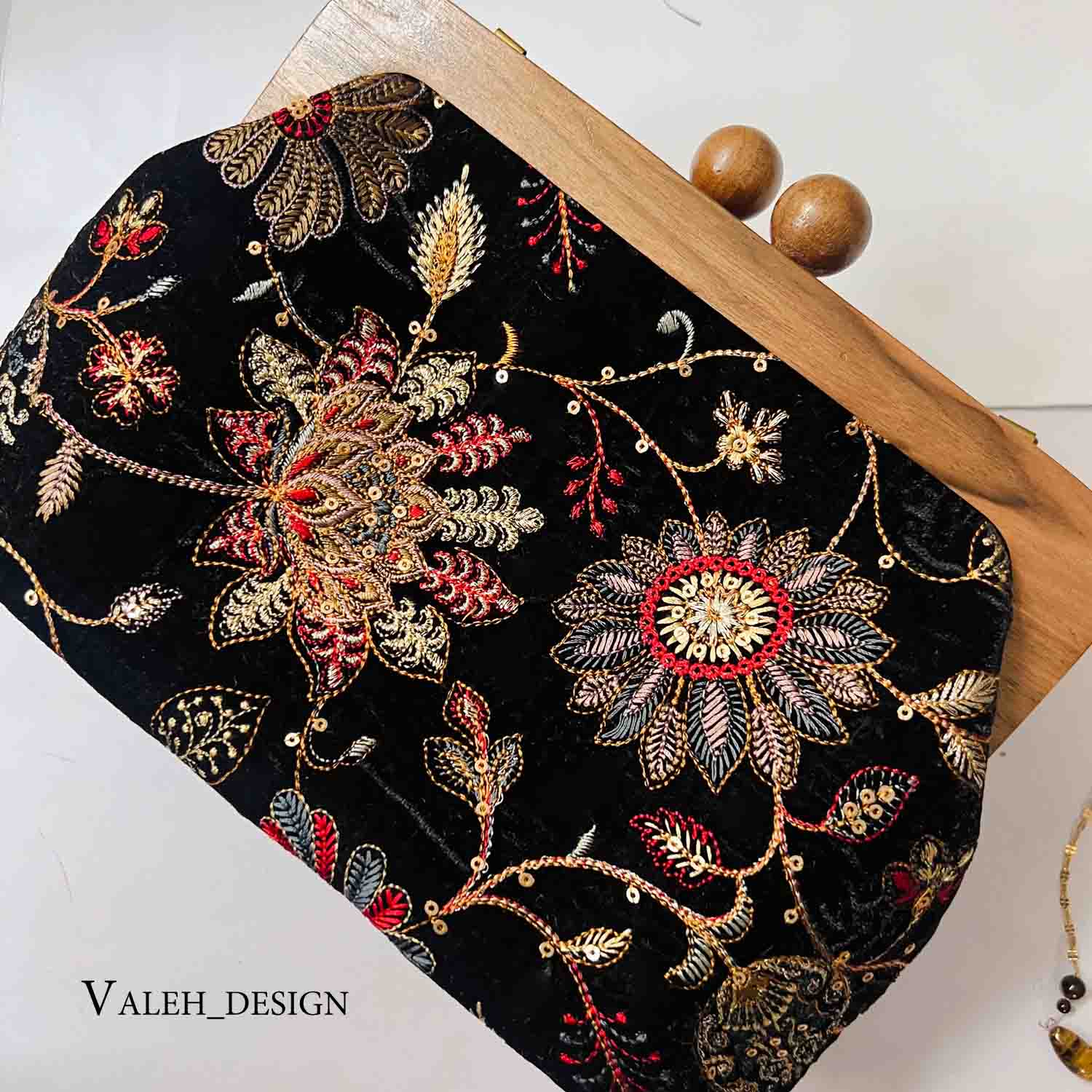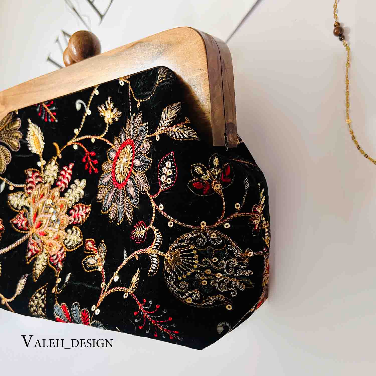 کیف واله : کیف دهنه چوبی مخمل مشکی سوزندوزی